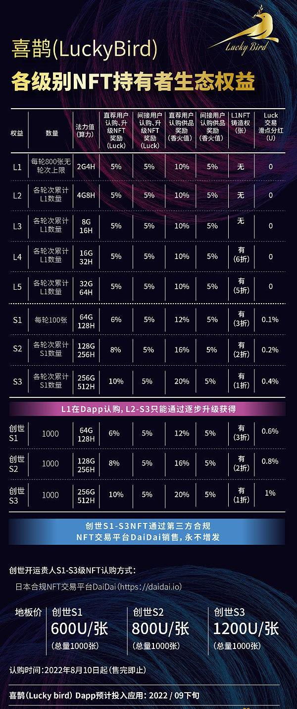 “创世GS1-3NFT的持有者就像一起来筹建动物园的人,动物园修好之后,未来的门票收益,就被前期参与修建的人垄断了。这是喜鹊价值分配创新的第一步。”Rebecca?Lee告诉世链NFT,GS1-3NFT的持有者还有更多丰富的权益,包括滑点分红和最大化的挖矿效率等等。最终,喜鹊(LuckyBird)会成为全球加密爱好者们一站式进入Web3的轻捷入口,也是诸多功成身退,已经不再抛头露面的行业思考者们联合打造的金融科技艺术品,“喜鹊凝结着我们对行业的敬畏和诚意,也只有Web3的匿名属性才可能调动如此多豪华的优质人力资源和行业资源,我们在Web3的热土上,依托DA0的分布式治理模式,一起创造奇迹,改变潮水流动的方向。”