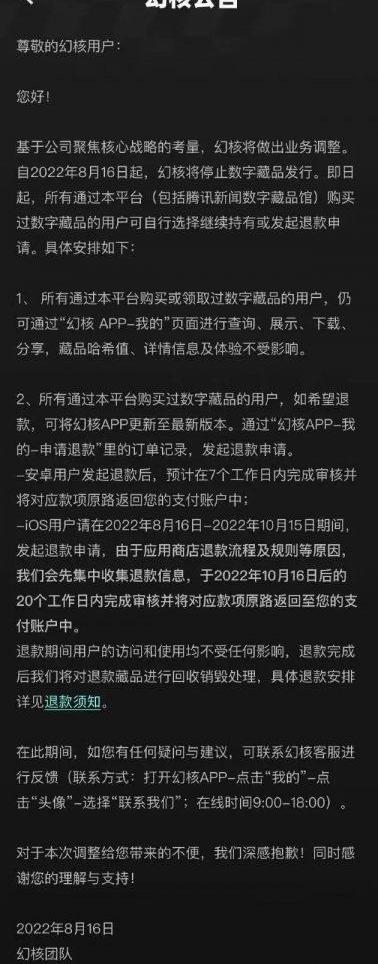 今日,数藏平台幻核发布公告,宣布正式停止数字藏品发行,进行全面清退,给出的原因是基于核心战略考量做出的业务调整。这一消息无疑给数藏行业扔下了一颗重磅炸弹,引起业内巨大震动。