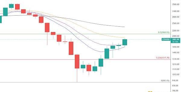 ETH走势一如既往强势,不过目前也接近强压区,周线压力1950、顶底1/2位2070以及月线压制1980,后面关注这一带能否突破,在未有效突破前,短线可以考虑逢高减仓。